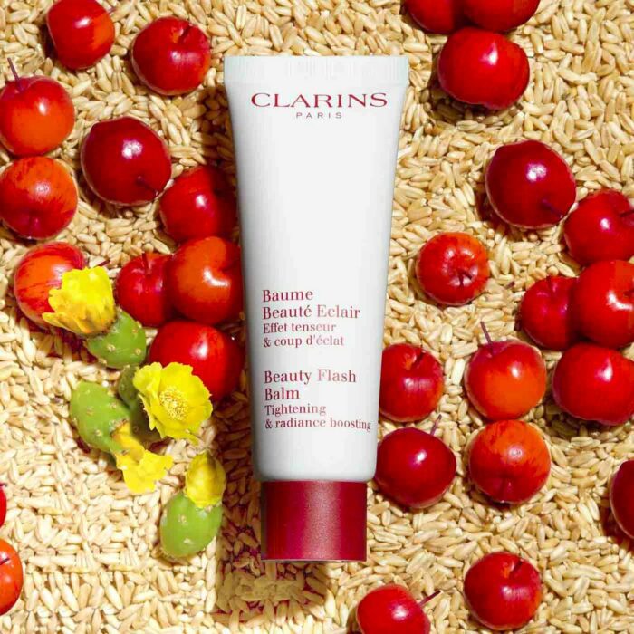 Baume Beauté Eclair est formulé avec 96% d’ingrédients d’origine naturelle pour un super cocktail éclat. De l’extrait de graine d’acérola qui contribue à énergiser la peau pour la rendre radieuse et éclatante et l’extrait de figuier de Barbarie qui aide à activer le renouvellement de la peau pour raviver son éclat. Il est aussi enrichi de sucres d’avoine bio à l’effet tenseur qui aident à retendre et à lisser immédiatement les traits du visage : ils sont reposés et plus lisses. Les marques de fatigue et les rides sont estompées. Il peut s’utiliser seul en soin quotidien, par-dessus le soin habituel, mélangé à son fond de teint liquide Clarins ou en masque.